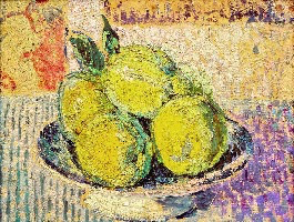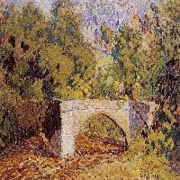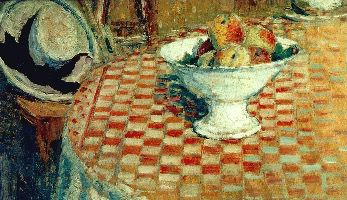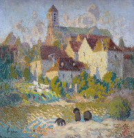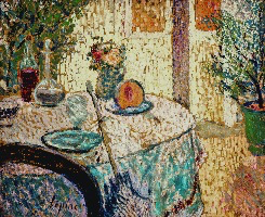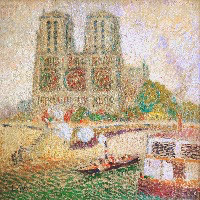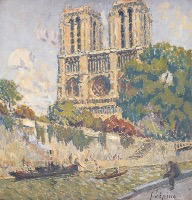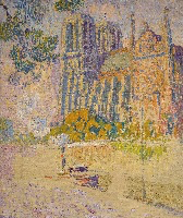 Le vert dans l’ombre de la nappe rouge, ou le mauve mêlé au sable de l’allée nous montre que le jeu des complémentaires apporte par ailleurs pour notre plaisir sensoriel un irrespect tranquille du réalisme des couleurs. La Notre-Dame qui fait vibrer la même palette transfigure la géométrie de son architecture et nous transporte dans un éblouissement similaire.