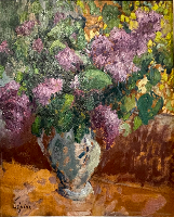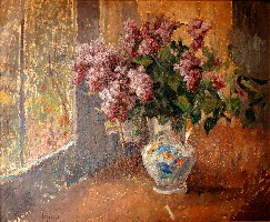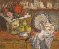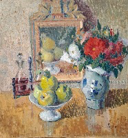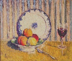 La Nature morte à Verdelais ne reste pas un motif isolé, et si nous ne trouvons pas autant de Tables qu’au début des années 1920, elles restent un incontournable de son œuvre. Le Bouquet de lilas fait l’objet d’un envoi en 1928, et deux versions ont une facture qui pourrait s’accorder à cette période de l’œuvre, même si aucune preuve tangible ne peut encore confirmer cette place. Les Pêches [avec le verre de vin] , en offrant la trace de leur envoi au Salon de L’Atelier de 1931, apportent non seulement la certitude de leur place dans l’œuvre, mais aussi du moment où Lépine introduit une petite modification dans sa facture des Natures mortes : un reflet très discret des porcelaines ou des verreries sur le dessus des meubles, et la place prise par ce choix des Intérieurs ; nous retrouvons aussitôt un tel reflet devant la Coupe de fruits [accompagnée] du linge de table.