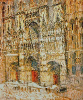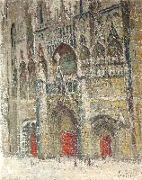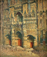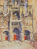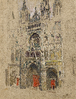Les premières versions de Rouen prolongent aussi – sur toute la surface du tableau – le travail qu’il déployait déjà avec les murs ensoleillés de Bernille , du Pont Valentré de Cahors , ou de façon similaire avec la Table au melon . Cette peinture est construite avec des touches de peintures et beaucoup de ‘’réserves’’ laissant apparaitre le support, comme si une dentelle de touches de peinture claire était posée sur le support de toile ou de carton, modérant à la fois l’éclat lumineux et l’intensité de la couleur.