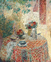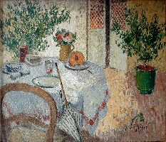 Avec la Nature morte , la table dans le jardin nous offre ses fleurs et ses fruits, Lépine nous parle de l’intimité et nous retrouvons le sentiment de sécurité et de bien-être. Cette peinture qui nous parait tellement simple et naturelle ne respecte pourtant ni les règles de la perspective, ni la représentation fidèle et réaliste des couleurs.