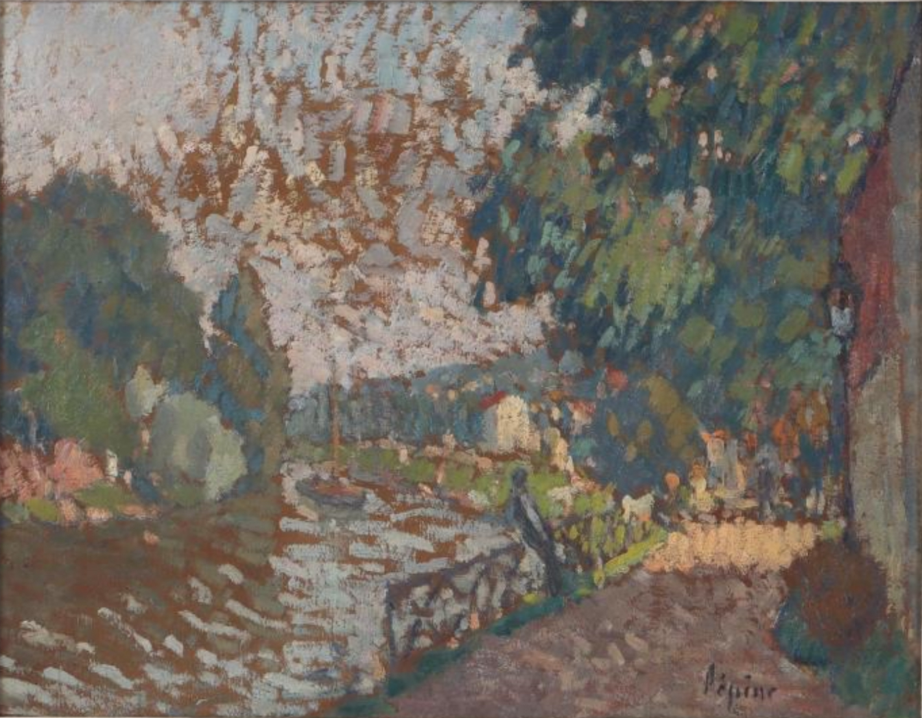 Bord de rivière hauteur 42,5 cm, largeur 54,5 cm Typologie de sujet : Promenade en bord de rivière – – – – |