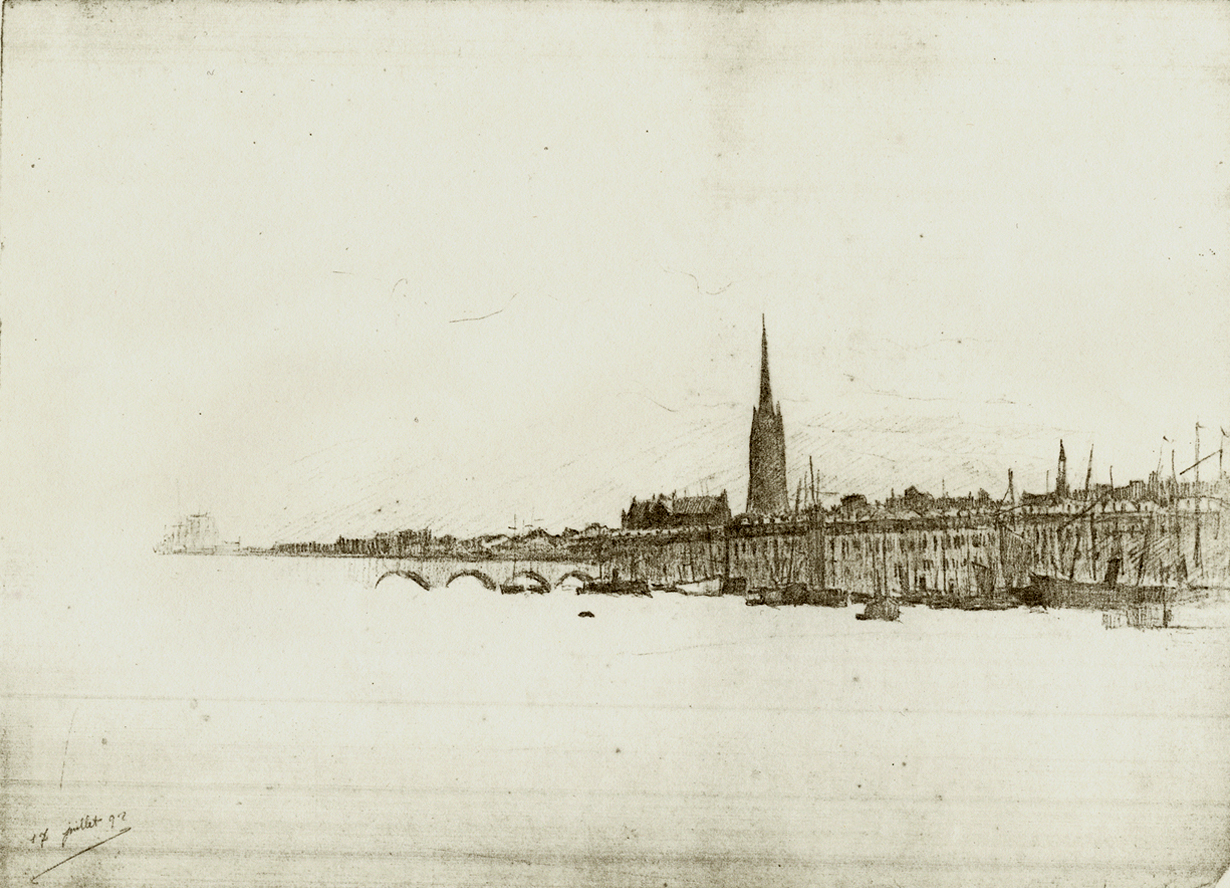 Bordeaux, la façade des quais et la flèche de Saint-Michel hauteur 23 cm, largeur 31.5 cm Typologie de sujet : – – – – – |