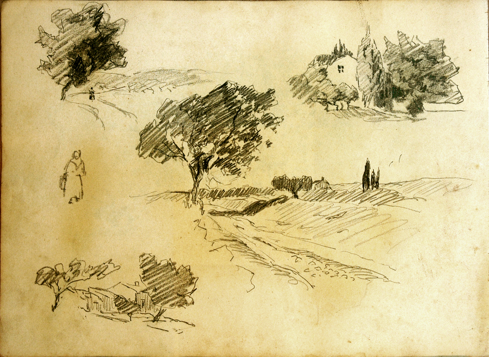 Quatre compositions de paysages ; silhouette de personnage