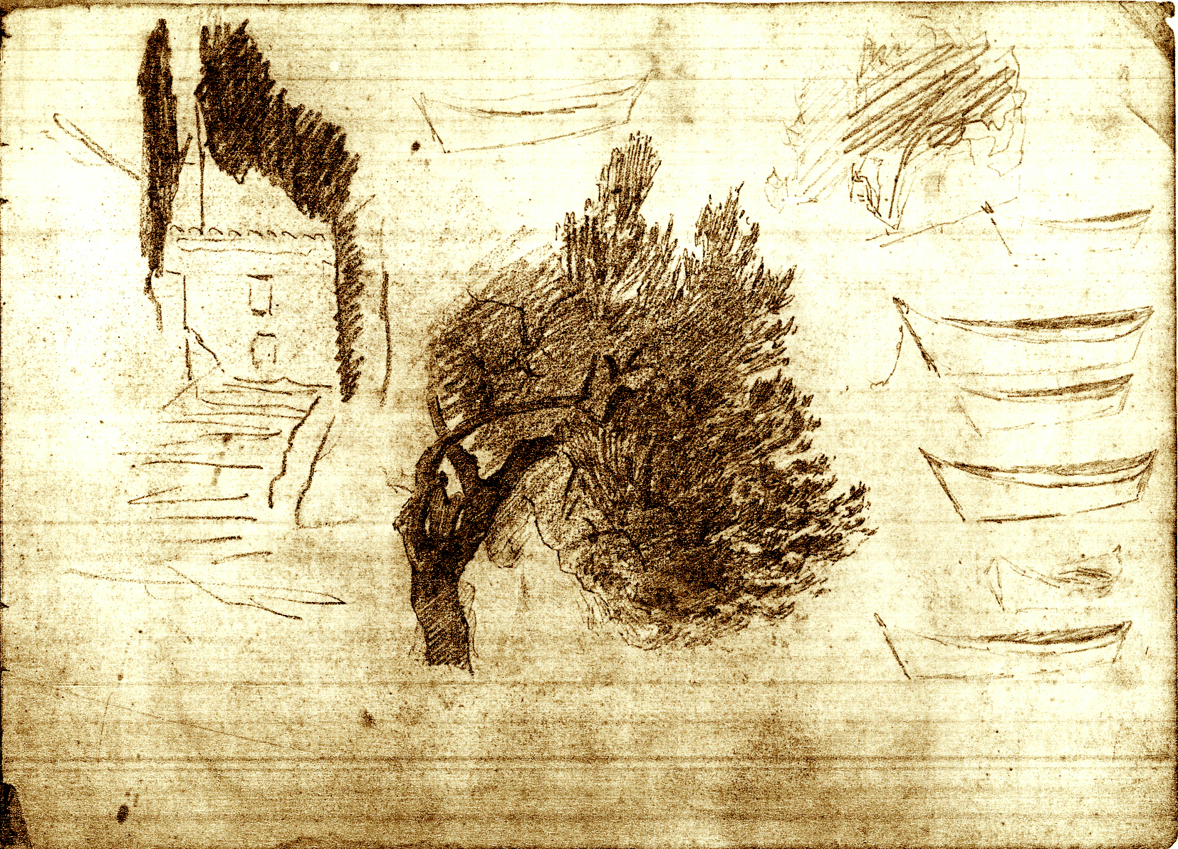Etudes d’arbre, bateau, et paysage hauteur 25 cm, largeur 34.5 cm Typologie de sujet : – – – – – |