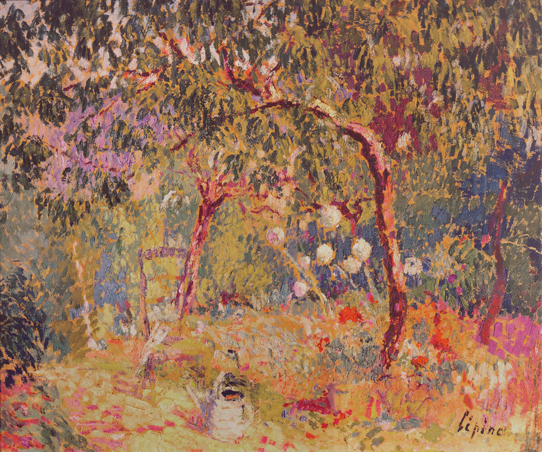Chaise et arrosoir dans le jardin